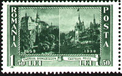 A hard to believe yet dear to the Romanian numismatics legend states that some of these coins were buried in the time capsule at the foundation of the Peleș castle at Sinaia. The coin was struck in 1868, and the castle built five years later in 1873, having been meant to resemble the Sigmaringen castle (the Romanian royal dinasty belonged to the Sigmaringen strain of the Hohenzollern family). We quote from the inauguration document of the castle, read on October 7th 1883 to the royal family: "I Carol I Prince and King and Elisabeth Queen. After two years of unrelenting endeavor struggling with an unstable realm crossed by springs, we have managed to put at the foot of the Bucegi Mountains the foundation of this building, in the year of salvation 1875, and of our reign the 9th. The construction was stopped in the times of the War for the Independence of Romania. We entered in this house of ours in the year of salvation 1883, and of our reign the 17th. We gave it the name of castle of Peleș." You can see inside the picture at right castle Peleș from Sinaia (implied in the 20 lei coins' legend) and castle Sigmaringen as well, at left (Romanian stamp from 1939). |