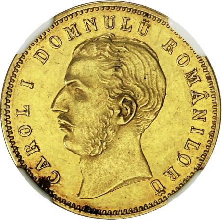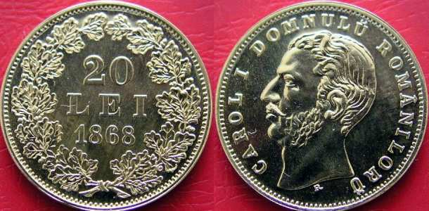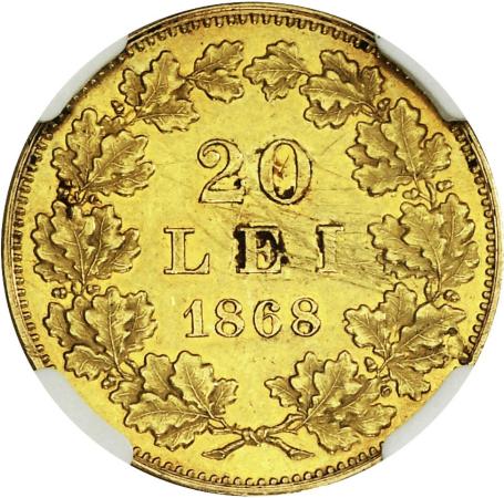 21 mm diameter, 6.452 g, gold 90%, copper 10%, flat edge denomination "20 LEI" and year 1868 inside a wreath formed by oak branches, outer pearl circle | inscription "CAROL I DOMNULŬ ROMÂNILORŬ" meaning "PRINCE OF THE ROMANIANS" and CAROL I head facing left, outer pearl circle Mintage: 100 or 200 coins |