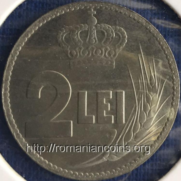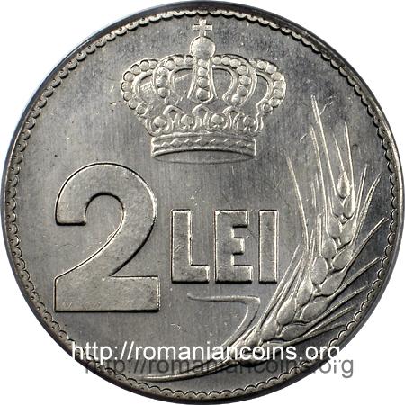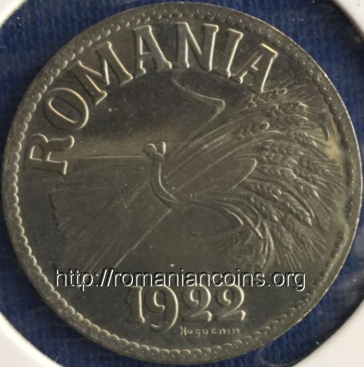face value "2 LEI", crown and wheat ear | outer pearl circle, ROMANIA, year 1922 and wheat sheaf, under 22 from year 1922 inscription Huguenin |