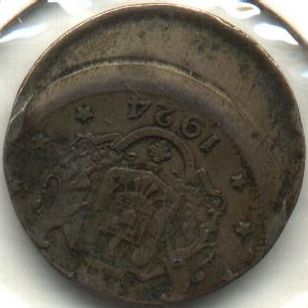 Another piece of 2 lei issued in 1924 featuring a striking flaw (most probably it has passed several times through the die) is presented below.