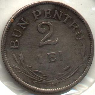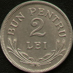25 mm diameter, 7 g, copper 75%, nickel 25%, grained edge, outer pearl circle inscription "BUN PENTRU" = GOOD FOR, denomination "2 LEI", wheat ears wreath | ROMANIA, year 1924 and Romanian coat of arms; both at left and right of the coat of arms three five-ray stars; outer pearl circle Mintage: 50.000.000 coins (Brussels) 50.008.000 coins (Poissy) |