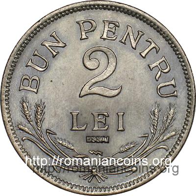 inscription "BUN PENTRU" = GOOD FOR, denomination "2 LEI", wheat ears wreath, below LEI inscription ESSAI meaning ESSAY in French and the mintmark of Poissy mint | ROMANIA, year 1924 and Romanian coat of arms; both at left and right of the coat of arms three five-ray stars; outer pearl circle |