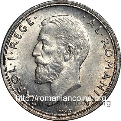 18 mm diameter, 2.5 g, silver 83.5%, copper 16.5%, grained edge denomination "50 BANI", ROMANIA, year 1911, crown and olive branches | inscription "CAROL·I·REGE· ·AL·ROMANIEI" meaning "KING OF ROMANIA" and CAROL I head facing left. Under the neck lies TASSET, the engraver's name. |