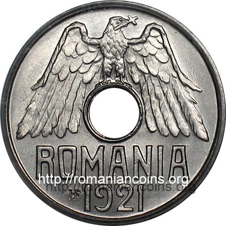 21 mm diameter, ~4 g, nickel, flat edge denomination "50 BANI", crown and HUGUENIN (incuse) | wing spread eagle holding a cross in its beak, ROMANIA and year 1921, monogram HF from Huguenin Frères & Co. |