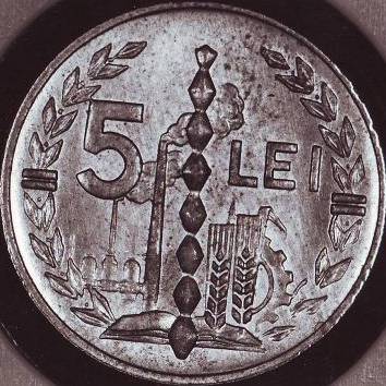 face value "5 LEI", laurel wreath, open book, gear wheel, two wheat ears, smoke flue and shape resembling an industrial background, the Endless Column of Tîrgu-Jiu | inscription "REPUBLICA SOCIALISTA ROMANIA" meaning "SOCIALIST REPUBLIC OF ROMANIA, Romanian coat of arms, year 1977 between two squares |