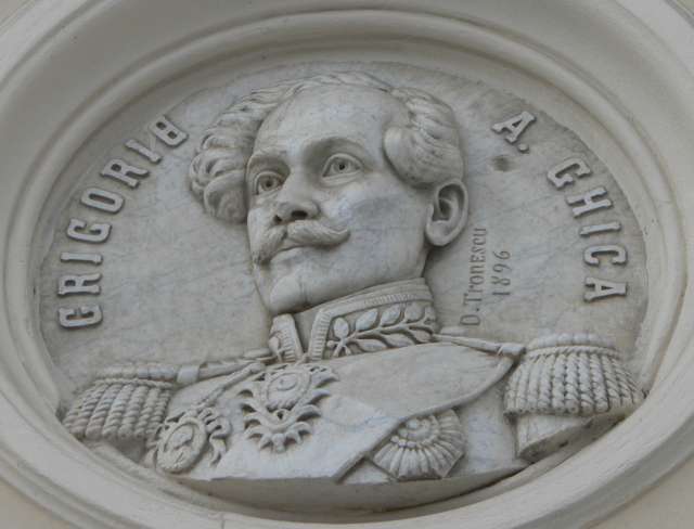 | Grigore Alexandru Ghica, domn al Moldovei între 1849 și 1856; în timpul domniei acestuia a intrat în vigoare (în 1851) "Așezămîntul pentru reorganizarea învățăturilor publice în Principatul Moldovei" iar în 1856 a fost înființată Facultatea de Drept din Iași; lucrare semnată D. Tronescu 1896 |