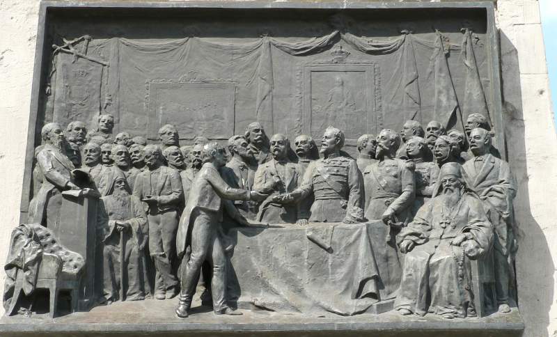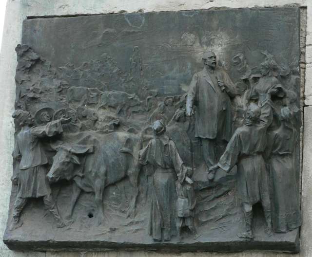 | basorelief reprezentând împroprietărirea țăranilor, de pe soclul statuii lui Mihail Kogălniceanu din fața corpului A |