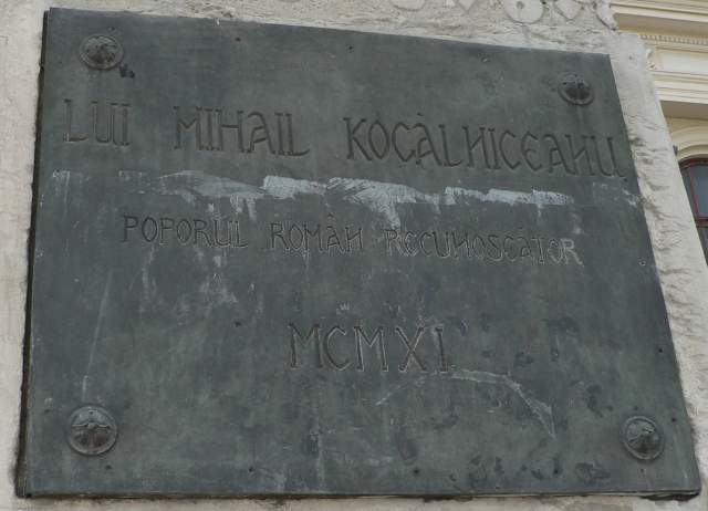 | placa votivă de pe soclul statuii; "LUI MIHAIL KOGĂLNICEANU / POPORUL ROMÂN RECUNOSCĂTOR / MCMXI" (1911) |