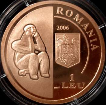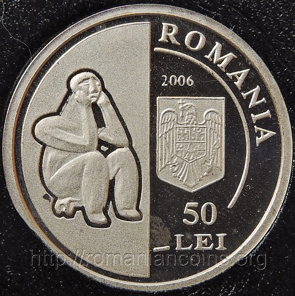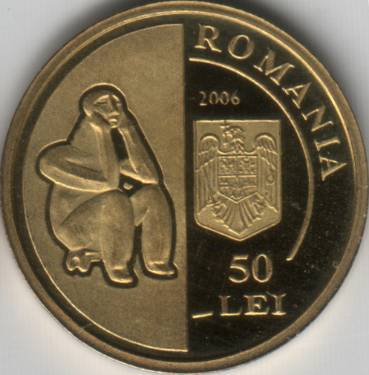 moneda: 6.452 g, aur 90% replica: 3.27 g, tombac aurit Avers: ROMANIA, anul 2006, stema României, valoarea nominală 50 LEI, Gînditorul de la Hamangia |