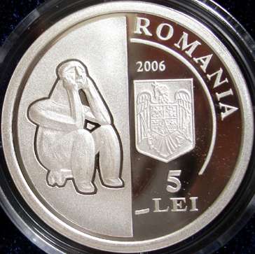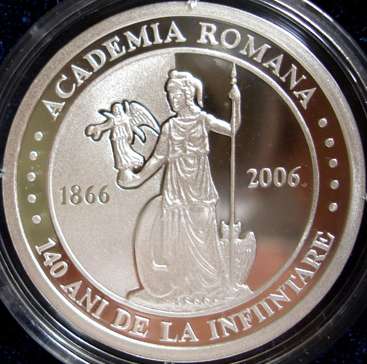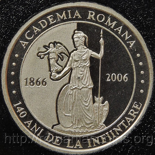 37 mm diametru, 31.103 g, argint 99.9%, margine netedă Avers: ROMANIA, anul 2006, stema României, valoarea nominală 5 LEI, Gînditorul de la Hamangia | Revers: inscripția circulară ACADEMIA ROMANA ····· 140 ANI DE LA INFIINTARE ·····, anii 1866 și 2006, zeița Minerva, emblema Academiei Române