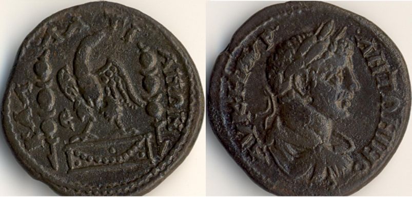26-27 mm diameter, 12.41 grams, AE Reverse: eagle with spread wings standing on a small altar adorned with a garland between two legionary standards, denomination value E (Epsilon), legend KAΛΛATIANΩN, outer pearl circle | Obverse: laureate Caracalla to the right, draped bust, legend AV K M AVP ANTONINO, outer pearl circle |